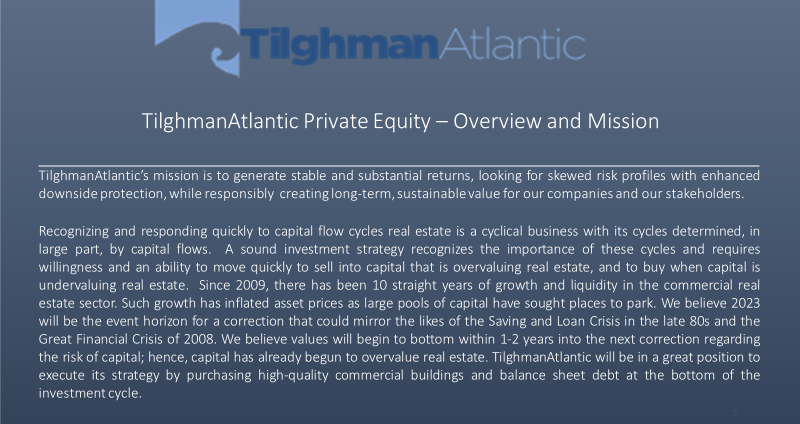 CEO + Chief InnovatorMichael R. Tilghman, Jr. founded Tilghman Atlantic to follow his vision of acquiring and managing underperforming, Class A office properties in key markets. Mr. Tilghman’s primary focus is developing sustainable buildings in urban areas. His niche of expertise is to develop and position large commercial buildings that operate on a centralized grid system. Mr. Tilghman has over 10 years of experience in developing, implementing and overseeing energy sustainability initiatives and Energy Conservation Measures.